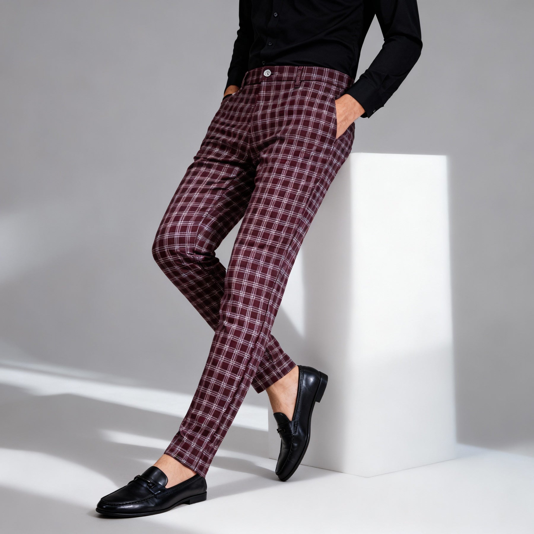 Tailored with a sharp, slim profile, these patterned trousers define the leg with a precise, structured fit. The smooth woven fabric keeps a crisp shape while moving naturally with the body. Finished with clean pleating, angled side pockets, and a refined waistband that keeps the look